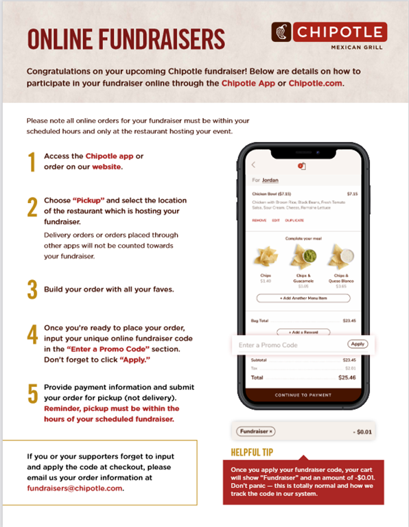 Order online and pickup Chipotle for your fundraiser by using the Promo Code 3QEZTYJ on the Chipotle app or website. Please note that fundraiser online ordering is only valid through pickup during your fundraiser’s scheduled date, time, and assigned restaurant. Ordering delivery for fundraisers is not permitted at this time.