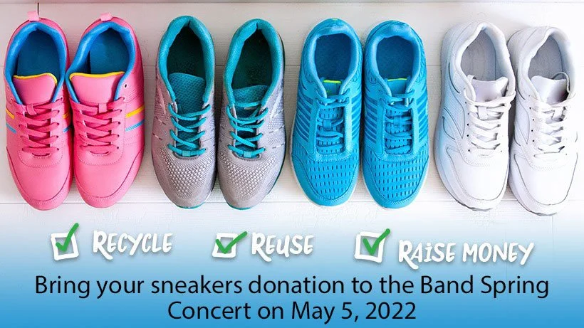 We know that most people have extra sneakers in their closets they would like to donate rather than throw away. By doing so, we raise money for our band needs and help the environment. It’s a win – win for everyone!